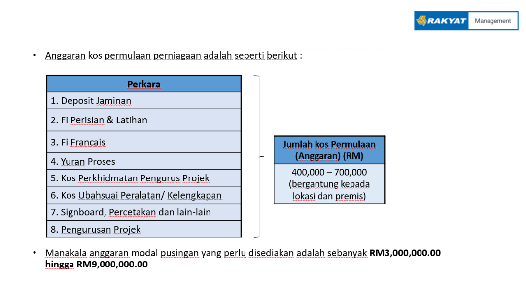 Keperluan Modal adalah sekurang-kurangnya RM 5 Juta.