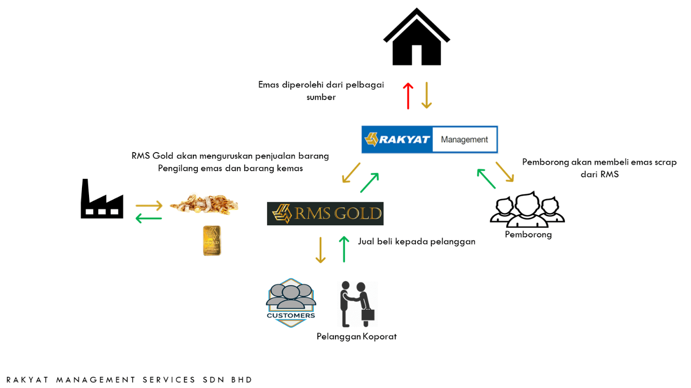 RMS ialah pemain utama dalam sektor perniagaan emas, menggunakan pendekatan yang pelbagai untuk mendapatkan dan menjual produk emas. RMS memperoleh emas daripada pelbagai saluran, termasuk lelongan kedua oleh Bank Rakyat dan Ar-Rahnu X’Change. Selain itu, RMS bekerjasama dengan pemain industri yang terkenal serta pengendali Ar-Rahnu lain, bagi memastikan rantaian bekalan yang pelbagai dan boleh dipercayai. Pasaran produknya termasuk penjualan semula barang kemas emas terpakai yang diperoleh daripada lelongan, yang dijual kepada pemborong dan pelanggan runcit melalui Kiosk RMS Gold.